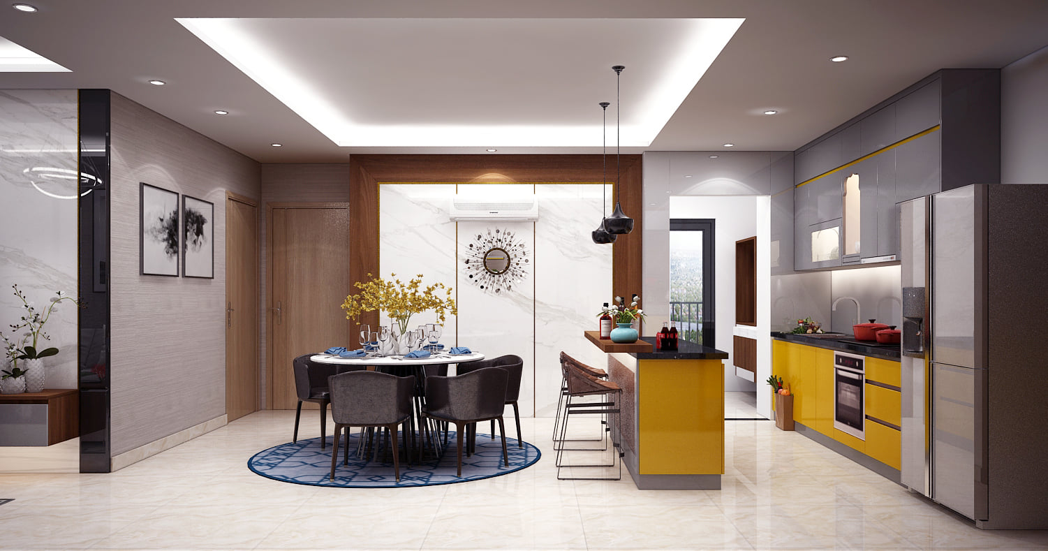 Thiết kế không gian mở ngày nay chuộng kiểu thiết kế phòng khách liên thông với nhà bếp. Đây cũng là một trong những giải pháp tuyệt vời cho những căn hộ nhỏ muốn tiết kiệm và tận dụng diện tích. Hai không gian bố trí liền nhau sẽ giúp tạo chiều sâu và giảm thiểu cảm giác ngột ngạt cho ngôi nhà.