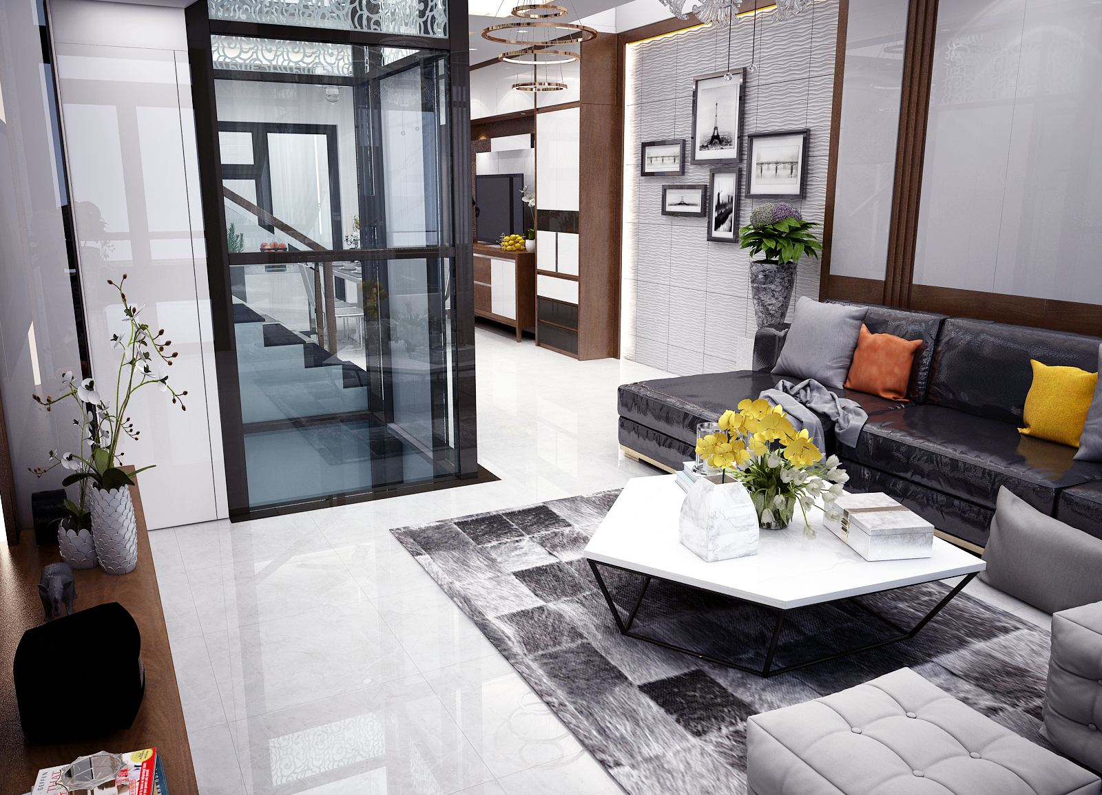 Một sự liên thông giữa phòng khách và bếp giúp không gian trở nên liền mạch, rộng rãi. Kết hợp với đó là thang máy được thi công bằng vách kính góp phần tạo nên vẻ sang trọng đẳng cấp trong nội thất cao cấp tại KDC Vạn Phúc.