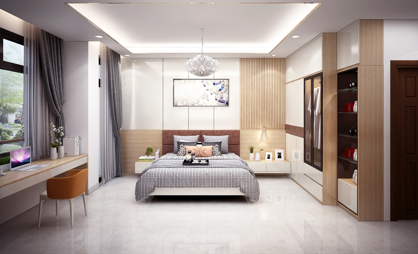 Vách đầu giường được thiết kế đụng trần, nhằm tạo ra sự liền mạch gắn kết không gian với tủ quần áo. Tủ quần áo được thiết kế và thi công sát trần nhằm tận dụng không gian bên trên để làm kho, chứa các vật dụng như vali , chăn ra, gối hoặc những vật dụng ít dùng trong gia đình….