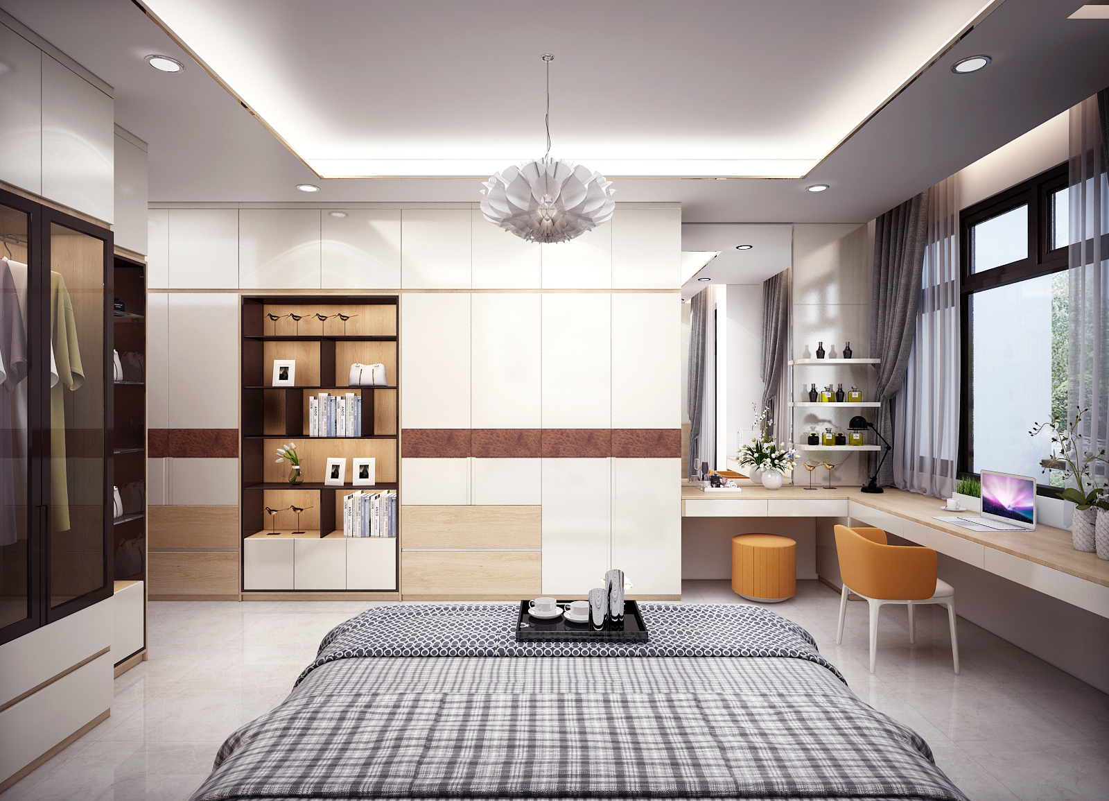 Bàn trang điểm là một nơi không thể thiếu đối với không gian phòng ngủ của chị em phụ nữ, là nơi cất giữ những bộ mỹ phẩm quan trọng giúp nàng xinh đẹp hơn khi ra khỏi nhà. Với thiết kế sang trọng bởi mảng kính lớn vừa giúp người đứng trước nó có cái nhìn tổng quan và rõ ràng hơn, vừa tạo cảm giác như có một không gian chuyển tiếp trong căn phòng làm căn phòng trở nên rộng rãi hơn.