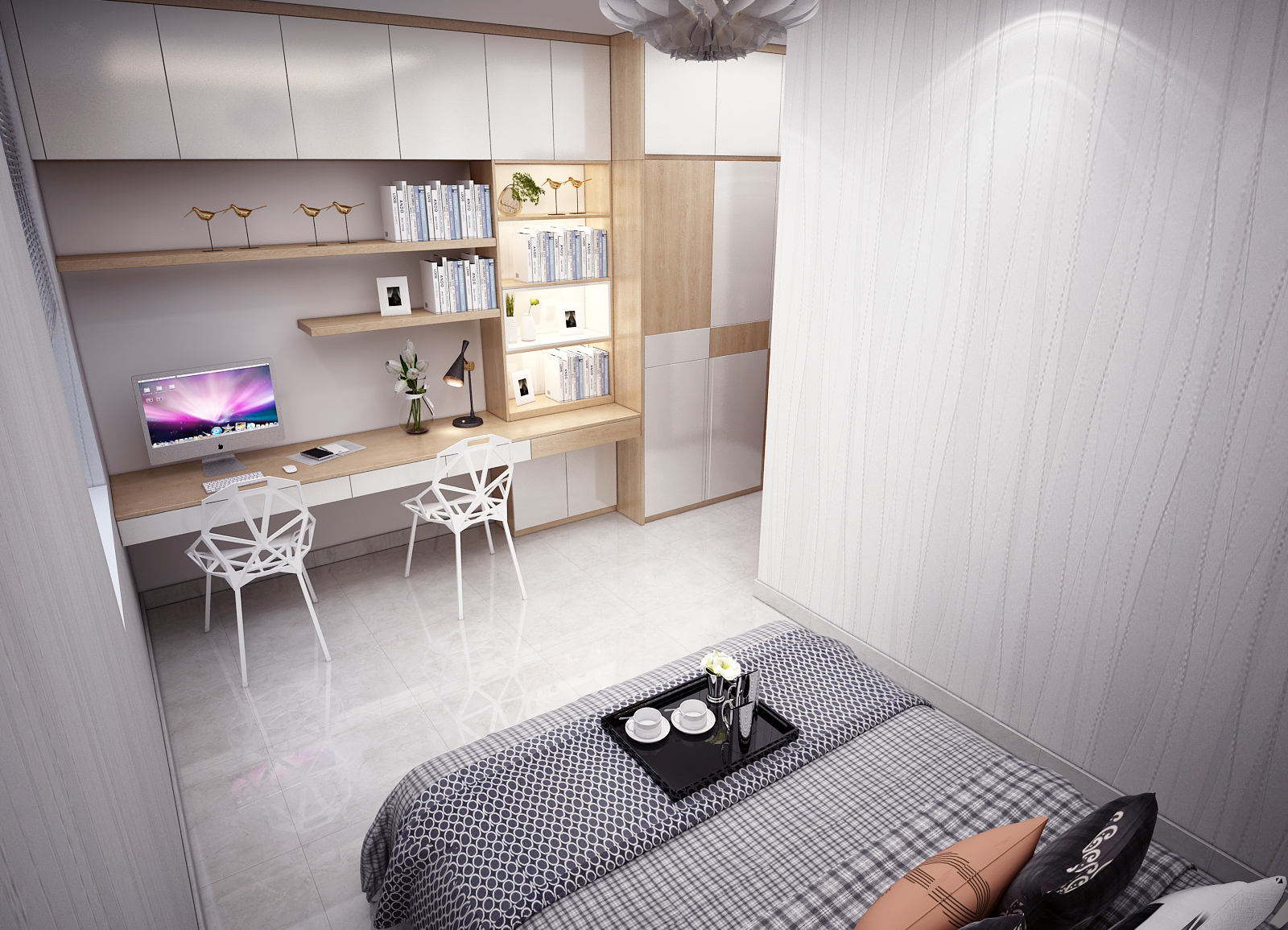 Phòng Ngủ Con Trai : Phòng ngủ bé trai được sử dụng màu sắc đơn giản hơn, với tông màu sáng kết hợp giữa vân gỗ và màu trắng tạo nên sự năng động,kích thích sự sáng tạo của trẻ.